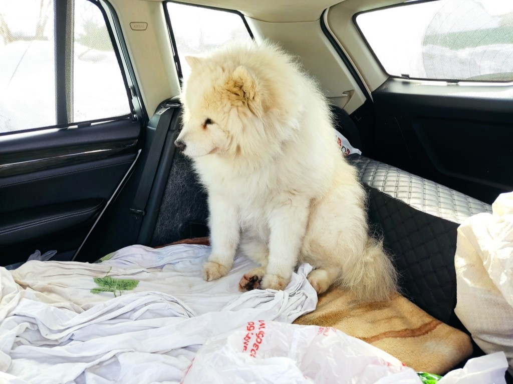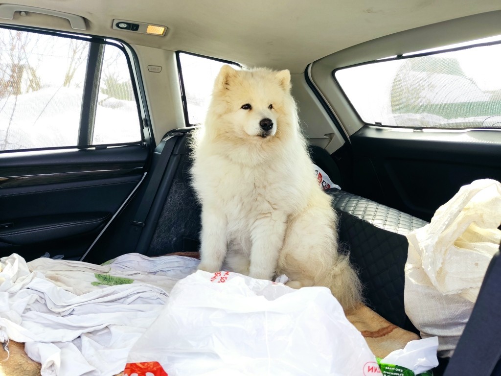 Огромный и спокойный. И очень дружелюбный. Он не произвел ни единого звука, пока к нему в салон Ауди мы с его хозяйкой размещали упакованные в пакеты фиалки.