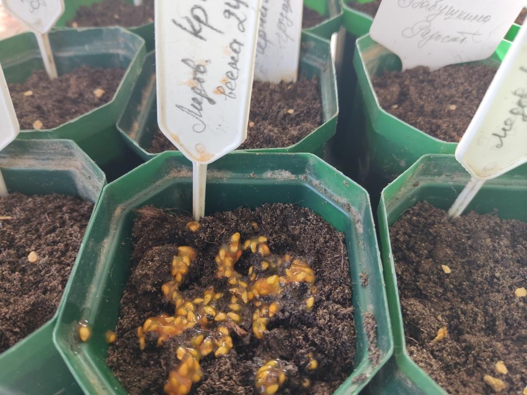 А потом выдавила из серединки семена в грунт прямо вместе с жидкостью. Я называю этот способ посева: с соплями.