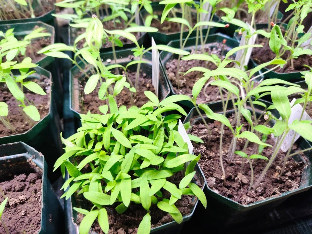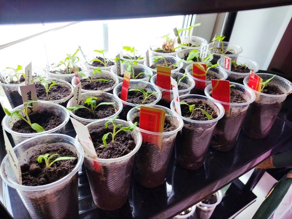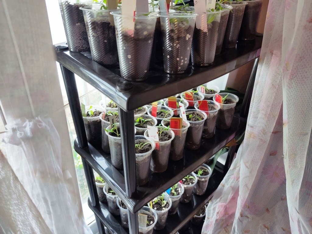 На стеллажах (фото выше) с подсветкой в прохладной комнате мои посевы быстро пошли в рост. Каждый сорт я сеяла в отдельны горшочки, в сего было посеяно 48 сортов.