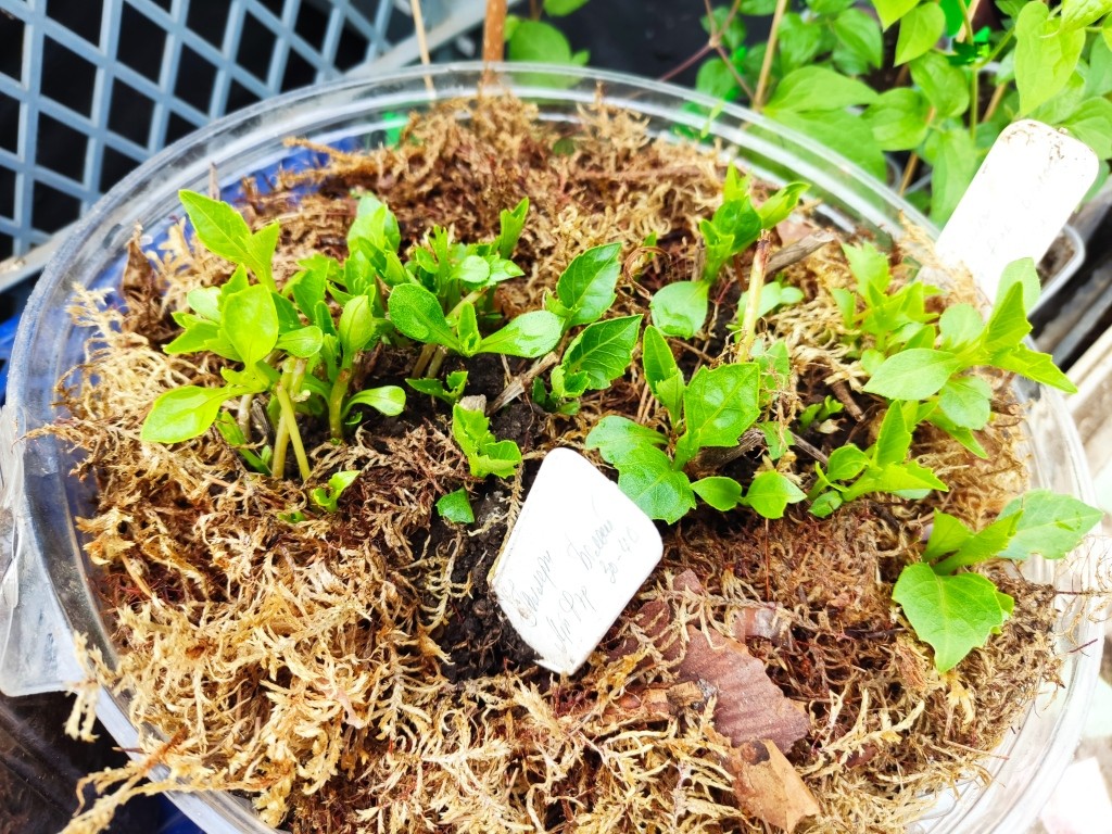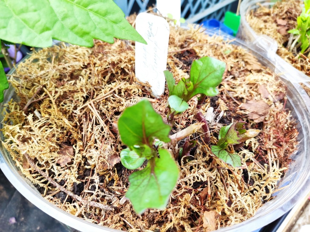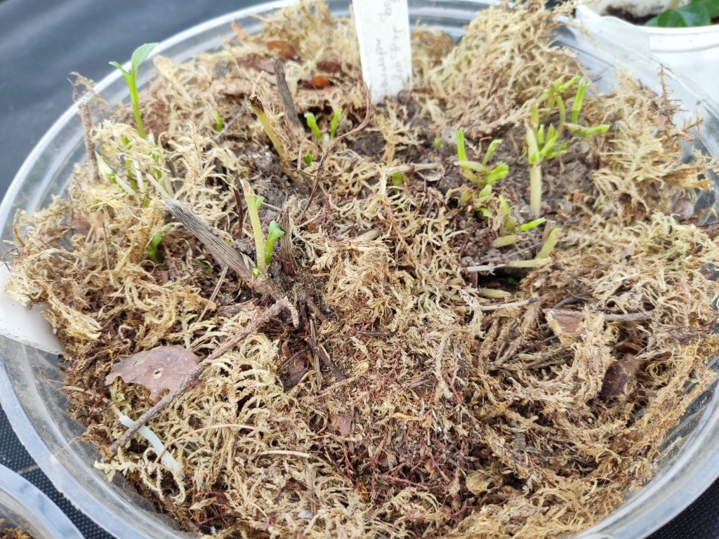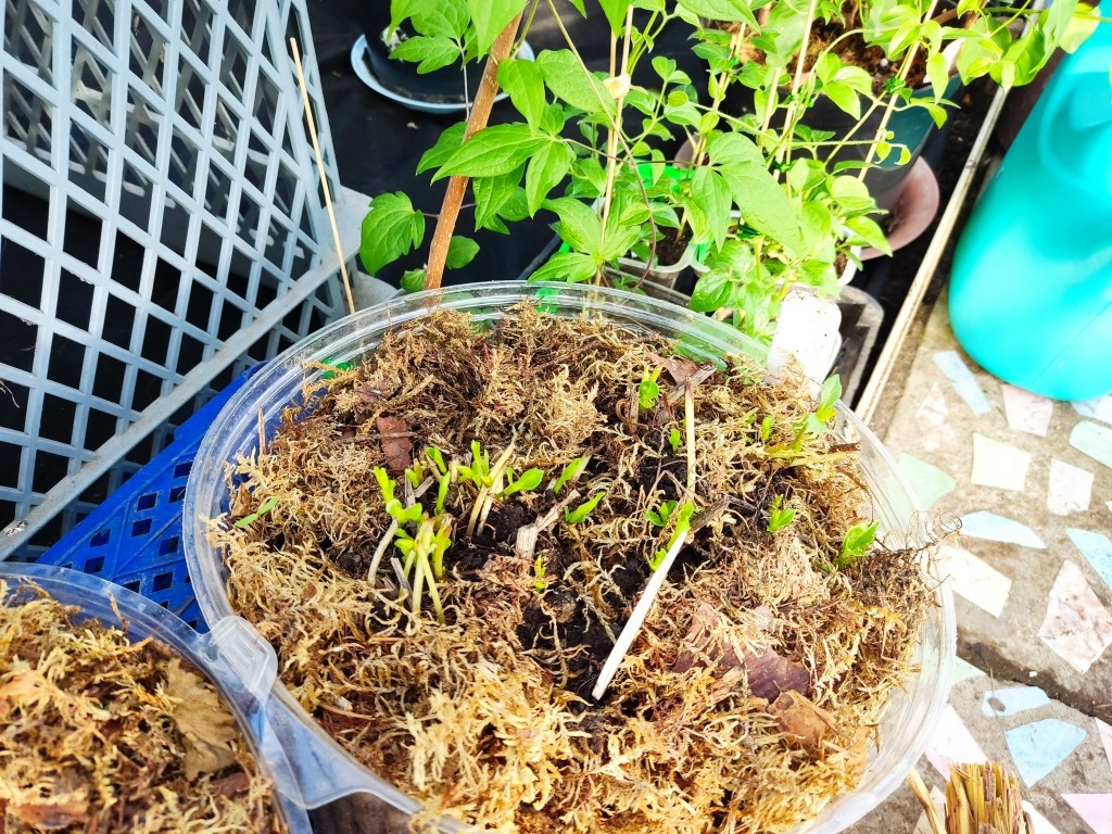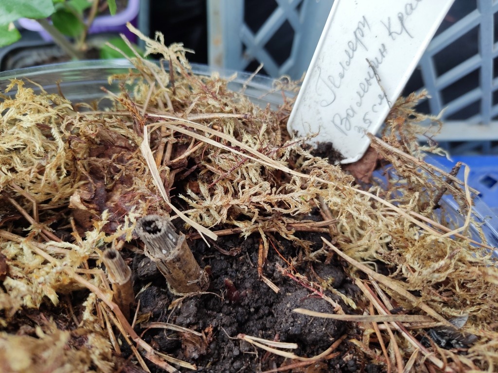 Затем уложила клубни в две коробки из-под тортов. Засыпала землей, полила и закрыла грунт сверху сухим мхом.
