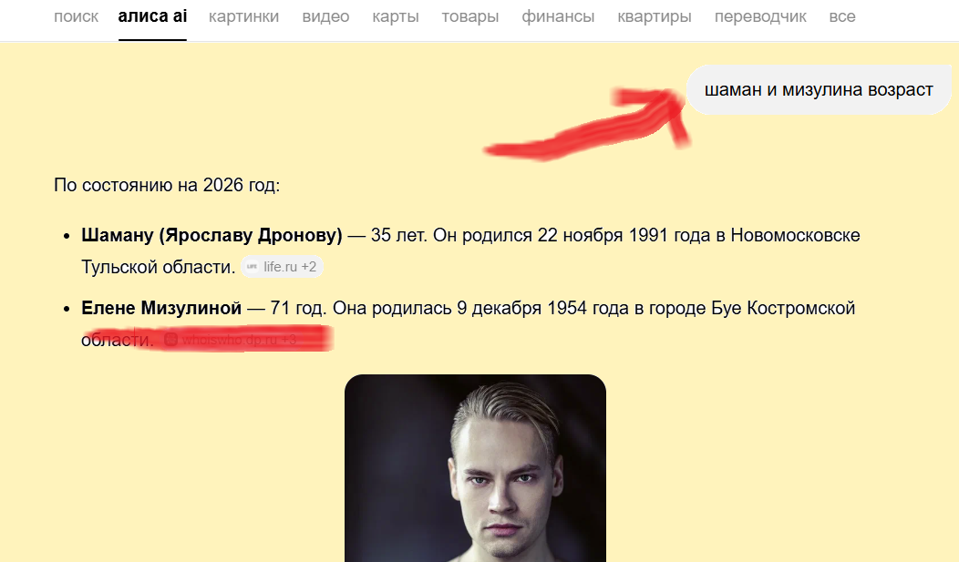 Кстати говоря, такой забавный факт, что если сделать запрос к Алисе, то она «поженит» Шамана и старшую Мизулину, вот так: