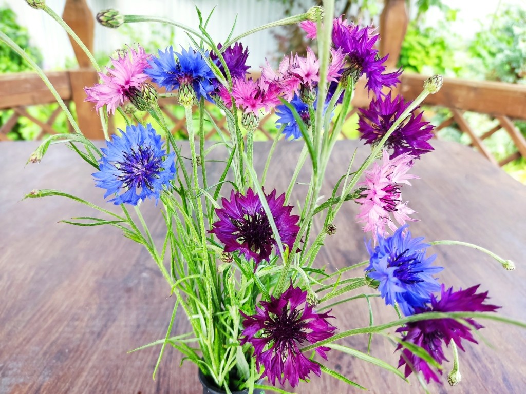 Начну с того, что три года назад я посеяла разноцветные васильки. Семена взяла у золовки ещё в 2015-м году. И хотя у неё были в основном фиолетовые, у меня выросли разных цветов: