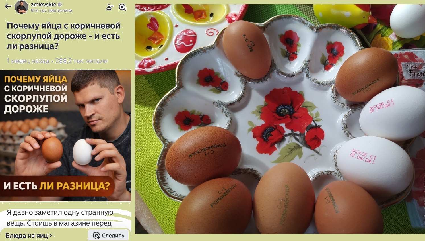На картинке выше: слева карточка статьи, которая мне попалась в ленте, а справа фото из моей статьи про категории яиц.
