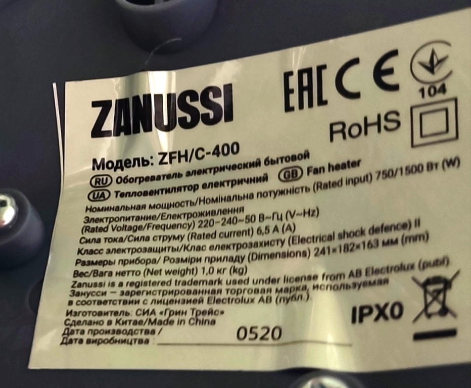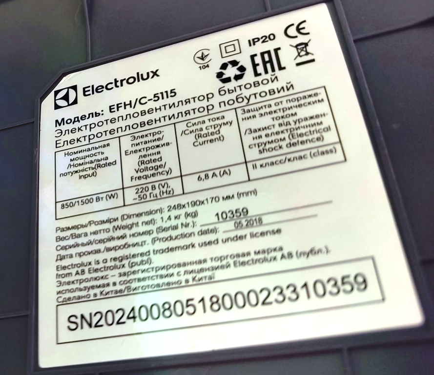 Итак, первый называется Электролюкс. Произведен в Китае в мае 2018 года. Другими словами, служит он нам 8 лет. Мощность 1,5 кВт. Вес 1,4 кг.