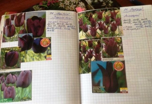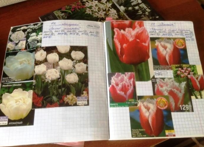 Раньше я вела специальную тетрадь, куда записывала цветение своих тюльпанов. Вот оттуда несколько страничек: