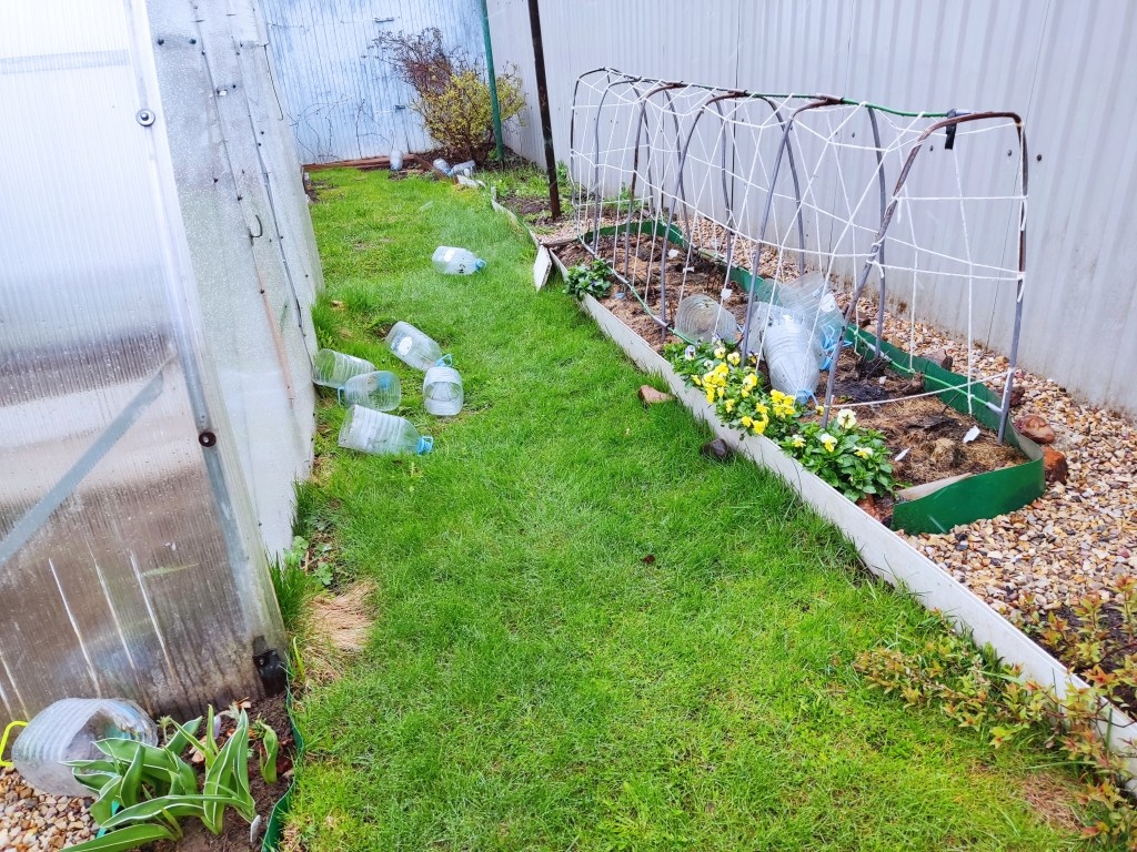 Вот и я снова быстренько оделась и помчалась проверять порядки. Заметила в окошко на кухне, что банки-укрытия с винограда разметало ветром по всему огороду.