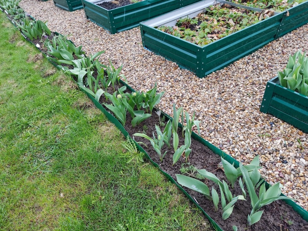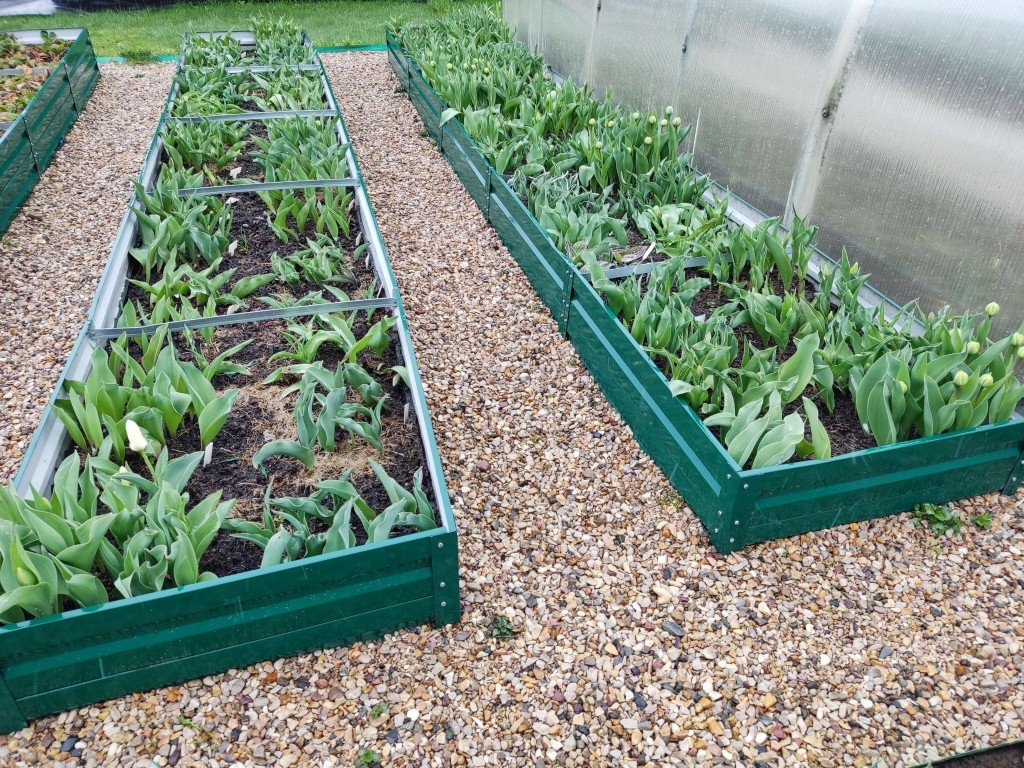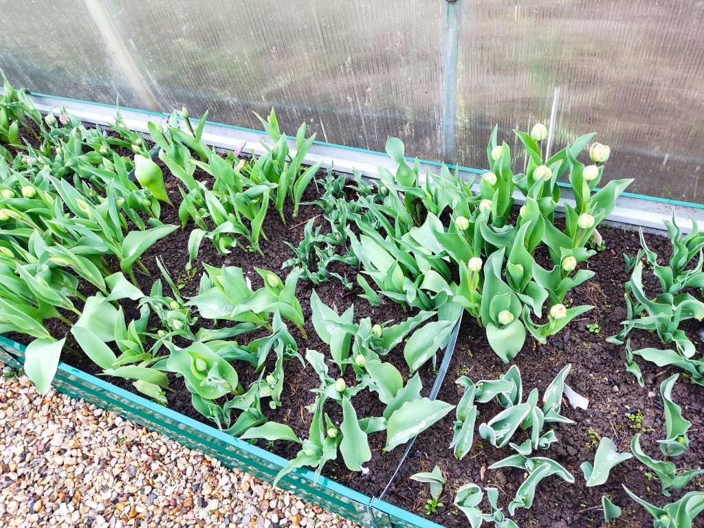 Немного повезло, что ветер с той стороны, где располагается помидорная теплица. В итоге, тюльпаны немного под прикрытием от ветра.