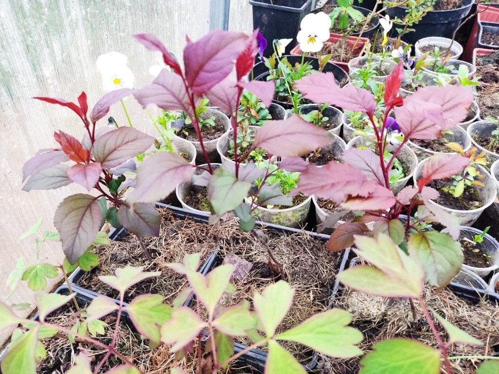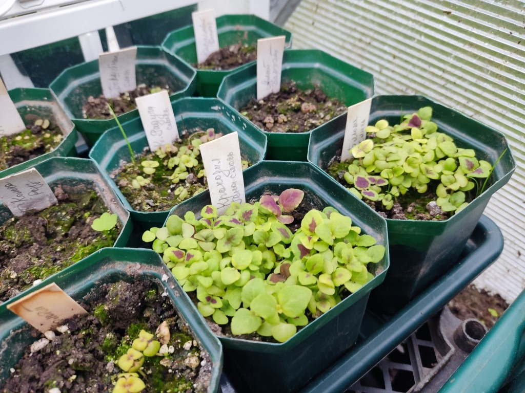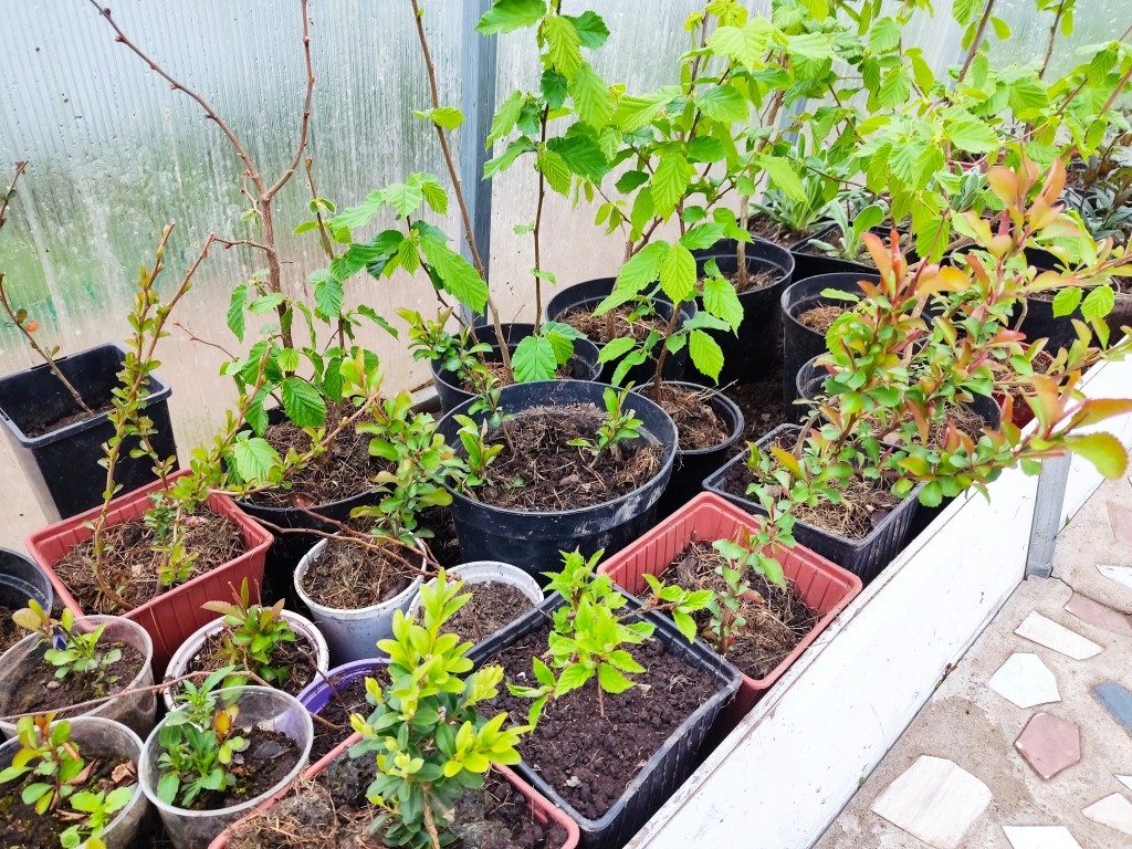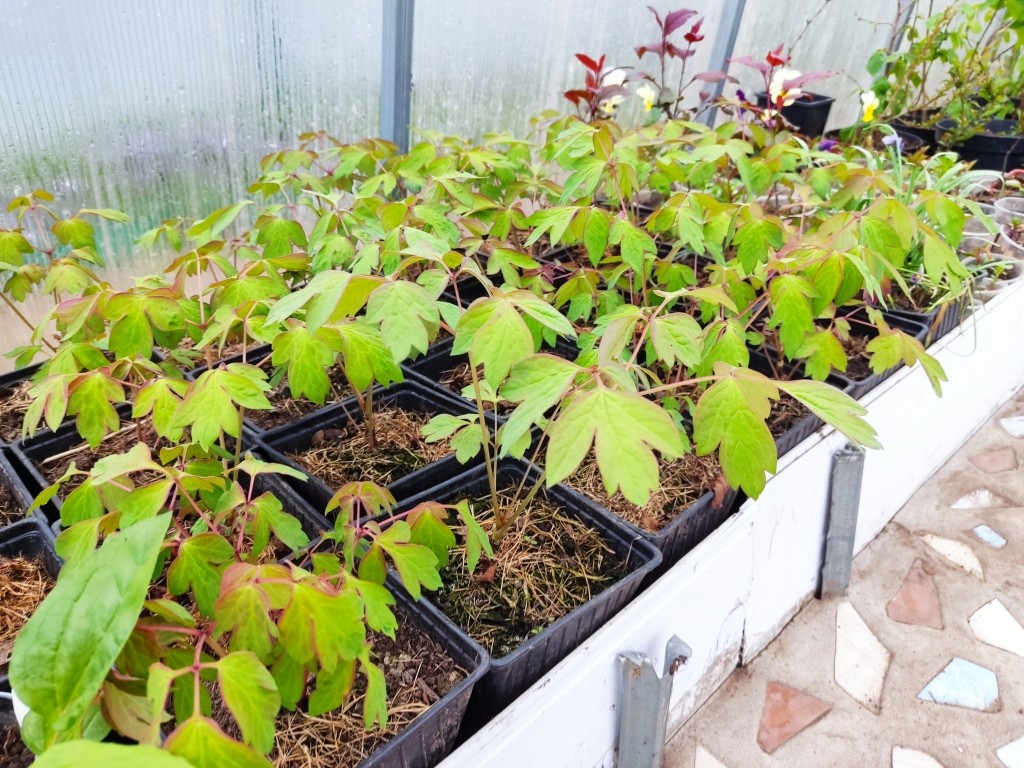 А на фото ниже — двухлетние сеянцы этих пионов. И в условиях теплицы (без отопления) они уже распустили листочки.
