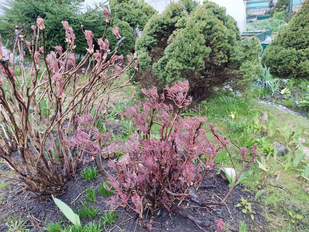 Там у меня зимовали древовидные пионы, которые я вырастила из семян. И на фото выше — взрослые кусты пионов на улице.